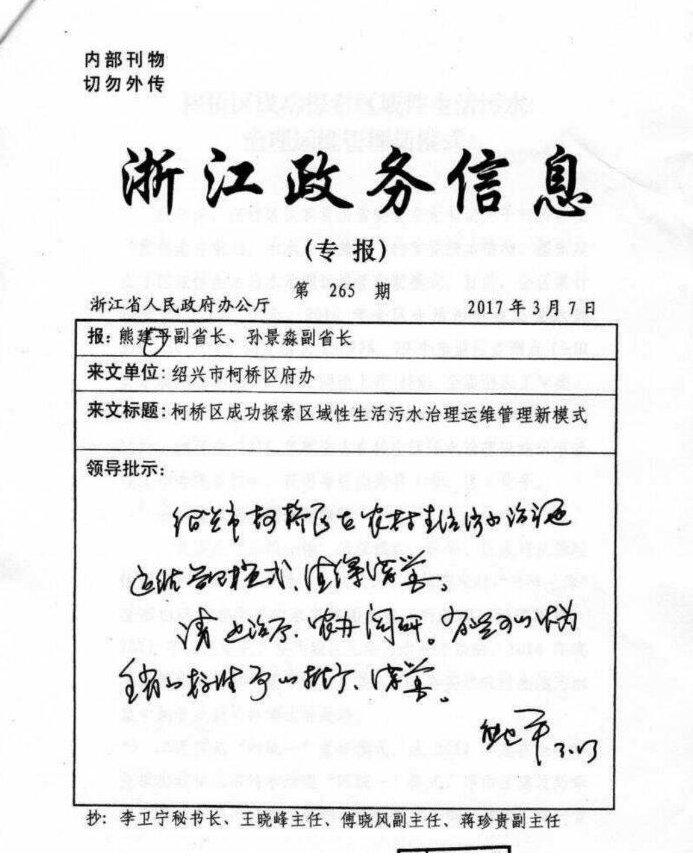 3月7日,浙江省副省長熊建平對(duì)《柯橋區(qū)成功探索區(qū)域性生活污水治理運(yùn)維管理新模式》進(jìn)行批示,認(rèn)為柯橋區(qū)在城鄉(xiāng)生活污水治理運(yùn)維管理模式值得借鑒,部分經(jīng)驗(yàn)可以作為全省的標(biāo)準(zhǔn)予以推廣、借鑒。