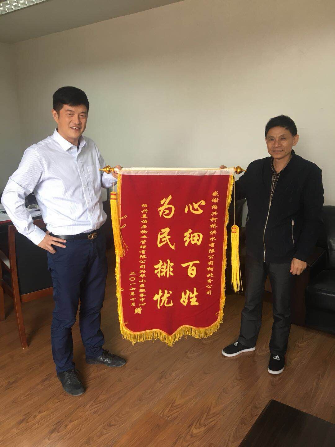 10月24日,華舍街道紹興美怡居物業(yè)管理有限公司興華小區(qū)服務(wù)中心負(fù)責(zé)人專程送來錦旗,感謝柯北分公司向他們提供優(yōu)質(zhì)高效的服務(wù)。
