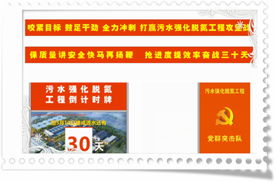 目前,在污水強化脫氮工程現場明顯位置,已樹立工程沖刺倒計時牌。公司要求,各級領導干部人員必須清醒認識到形勢嚴峻,要在最后1個月的時間里拿出更大的干勁全面沖刺,確保工程建設任務的按期完成。同時,公司黨支部錢書記也特別強調,要充分發揚黨員干部先鋒模范帶頭作用,使廣大黨員平常時候看得出來、關鍵時刻站得出來、危急關頭豁得出去,要將把黨的政治優勢轉化為項目推進優勢,把黨建力量凝聚為奮斗合力,確保工程順利建成通水。